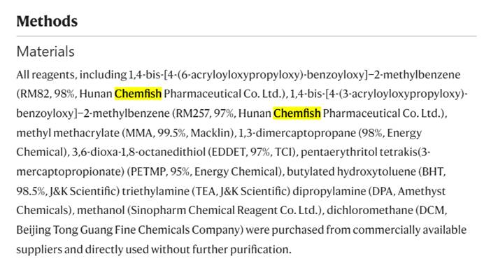 文章特意介紹使我公司 湖南嘉航醫(yī)藥科技有限公司(Hunan Chemfsh Pharmaceutical Co.Ltd.)提供的雙丙烯酸酯液晶單體(RM82和RM257)作為關(guān)鍵原料。RM82用于合成具有結(jié)晶能力的線性液晶聚合物(c-LCP),而RM257則用于制備主鏈液晶網(wǎng)絡(LCN)基體。這兩種單體的選擇對于實現(xiàn)LC-semi-IPN的優(yōu)異性能至關(guān)重要。通過合理設計和制備,LC-semi-IPN在機械性能和能量耗散能力方面相較于單一液晶網(wǎng)絡有了顯著提升。文章強調(diào)了CHEMFISH產(chǎn)品在合成高性能液晶聚合物中的關(guān)鍵作用,這些產(chǎn)品為開發(fā)新型能量耗散材料提供了重要支持。