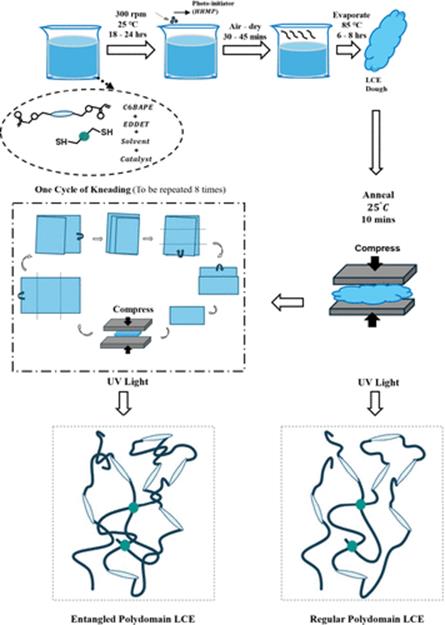 糾纏 LCE 的制造過(guò)程。示意圖說(shuō)明了 LCE 面團(tuán)的合成,然后對(duì) LCE 面團(tuán)進(jìn)行機(jī)械揉捏以形成高度纏結(jié)的 LCE。與常規(guī) LCE 相比,捏合過(guò)程會(huì)引起更高密度的纏結(jié)。