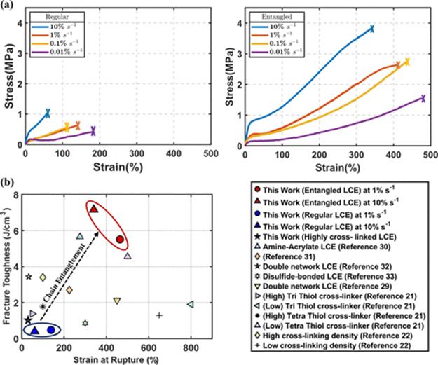 圖 2.纏結(jié) LCE 的機(jī)械性能。(a) 不同應(yīng)變速率下常規(guī)和纏結(jié) LCE 之間的應(yīng)力-應(yīng)變曲線比較。(b) 文獻(xiàn)中糾纏多域 LCE 與各種其他多域 LCE 的斷裂韌性和斷裂應(yīng)變的比較。